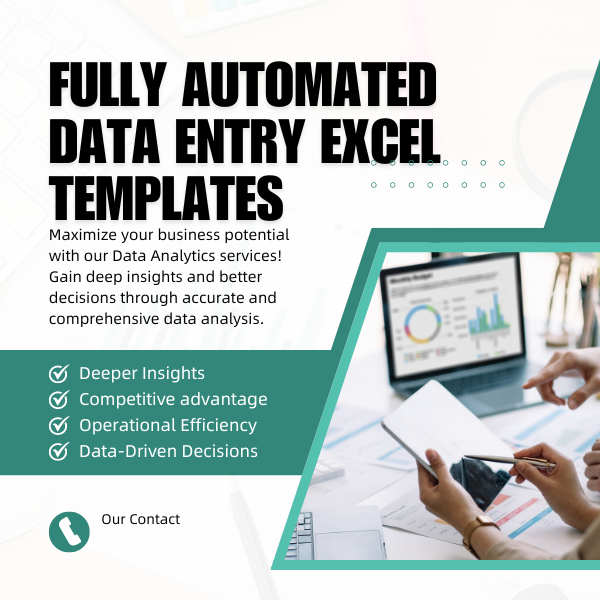 Our Fully Automated Data Entry Excel Templates simplify data management by automating input and analysis. These user-friendly templates reduce errors and save time, making them ideal for businesses, freelancers, and students. Whether you need to manage finances, inventory, or projects, our templates streamline the process, allowing for more efficient and accurate data handling.